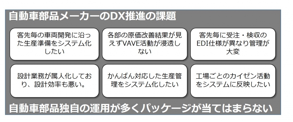 他社パッケージとの連携も可能で、現在のご資産や導入したいパッケージを自動車部品メーカー向けにアレンジすることも承ります。