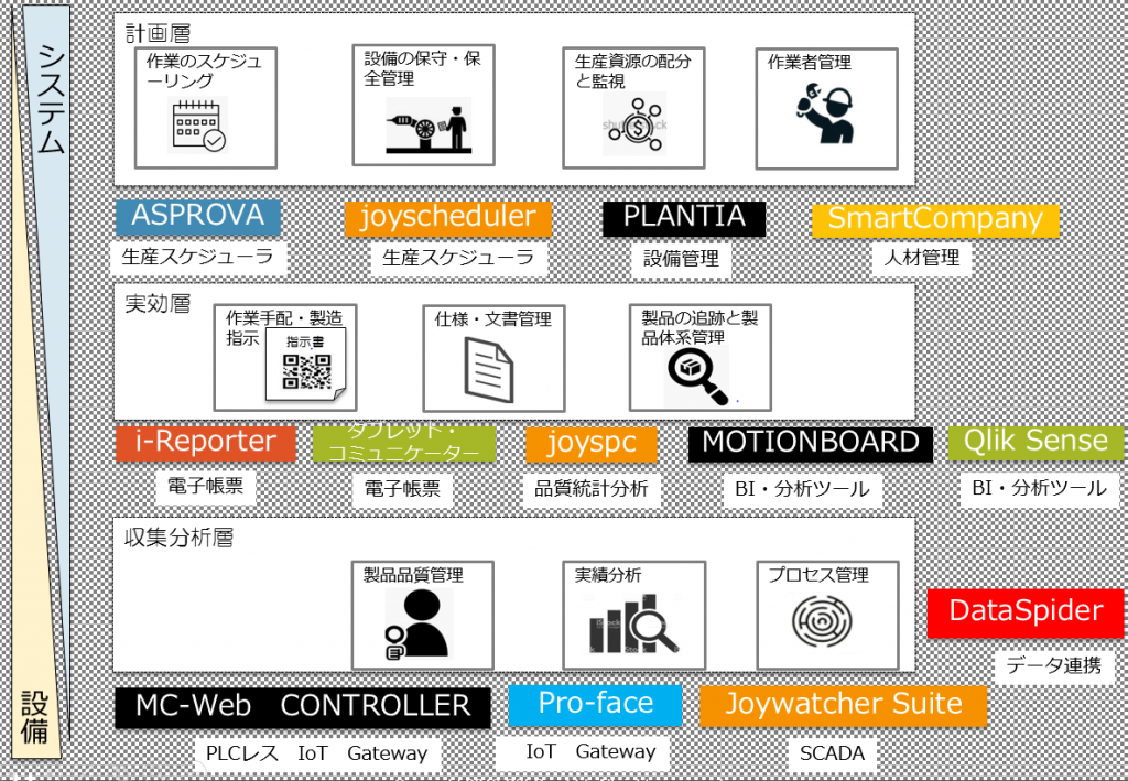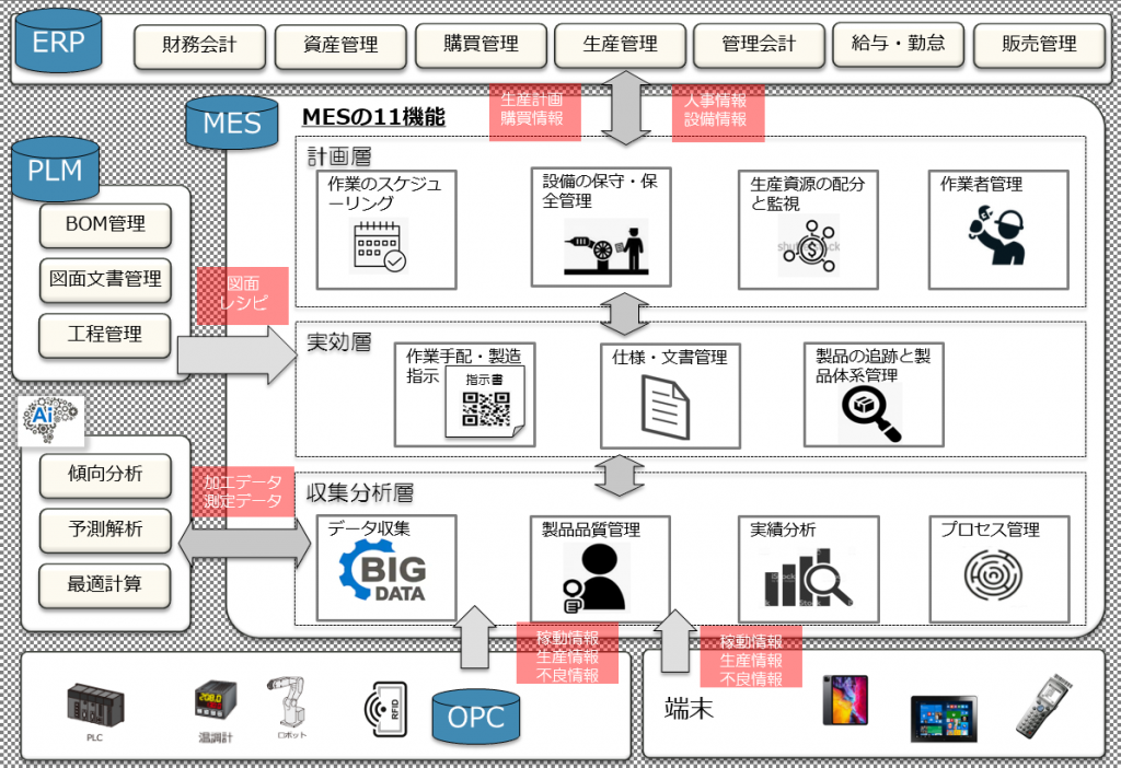 「MES」は、主に工場で利用され、生産の実績を集計分析したり、設備や作業者に作業内容を知らせたりするシステム基盤です。現在は、IoT・AIなどの情報テクノロジーの発展で自動化・データ解析による最適条件の計算が行えるようになり、工場のオートメーション化、製品のマスカスタマイゼーション化などモノづくりに変革を与える基盤として各国で官民一体となって取組みが行われております。