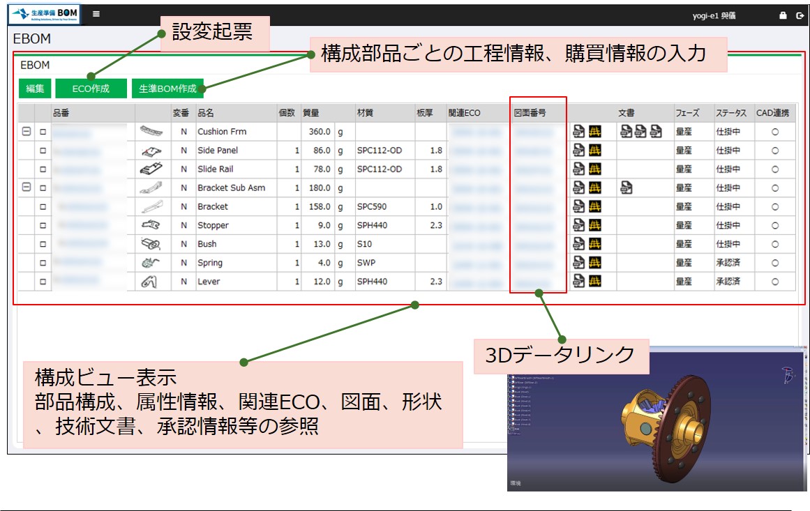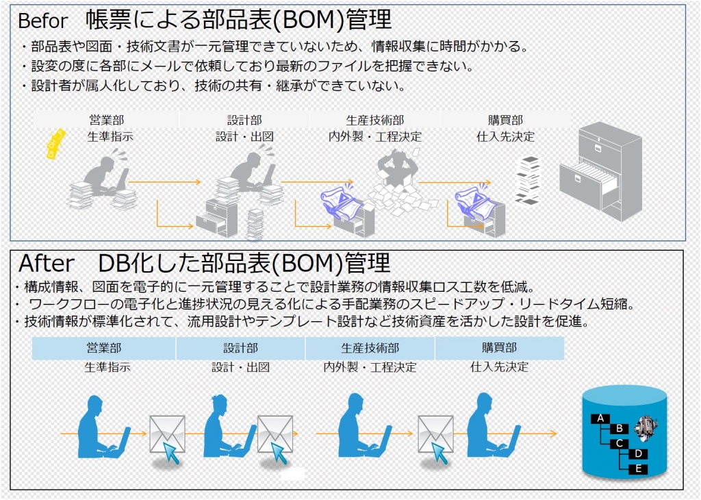 図面・技術情報を部品構成毎に管理を行い全社で共有します。
