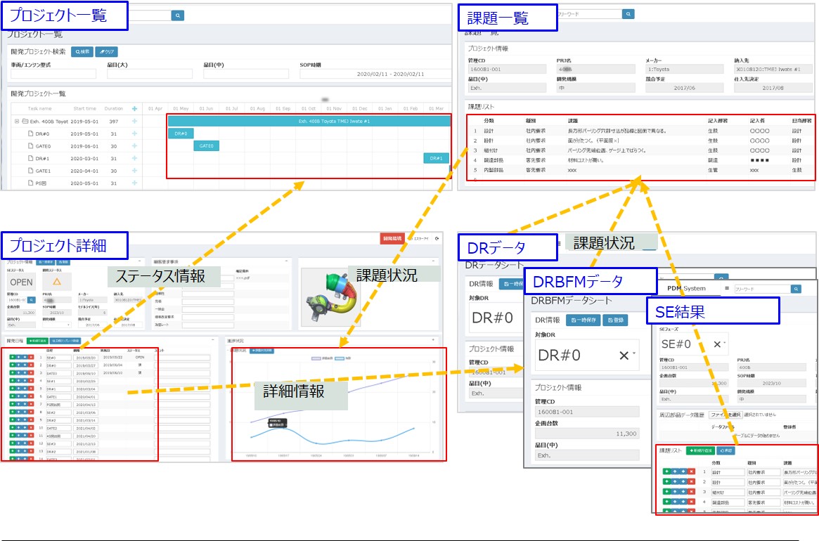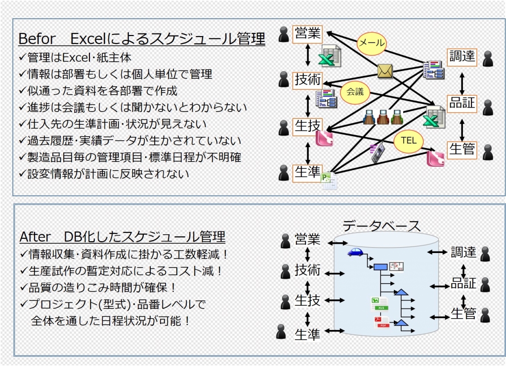 生準日程管理得意先毎に車両開発期間の日程を管理して、試作日程・金型作成・量産移管などの社内イベントまでスケジュールを落とし込み計画を自動立案します。
