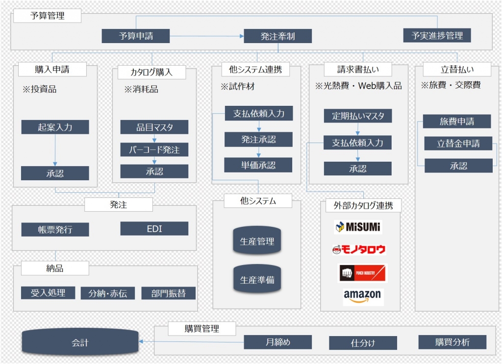 予算管理機能やカタログ品登録などにより各部を牽制することで不要なモノを買わせず、必要なものをより安く購入できるように支援します。
