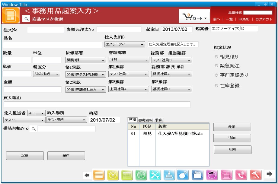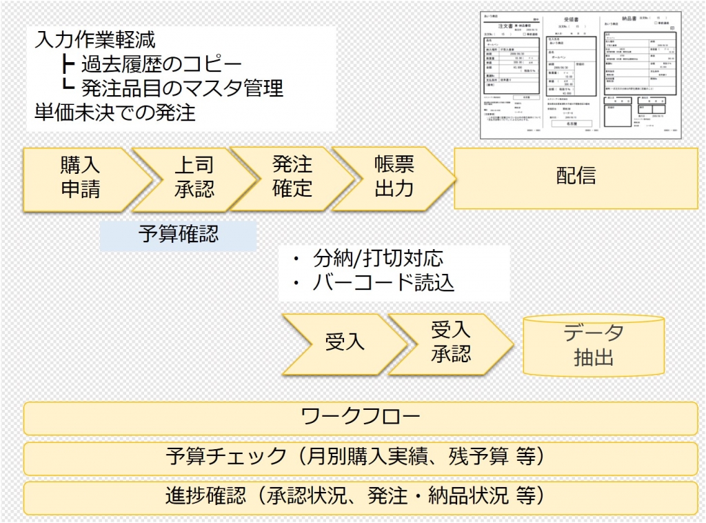 購買伝票の電子化で予算、申請、購入、納品、検収まで一括管理します。