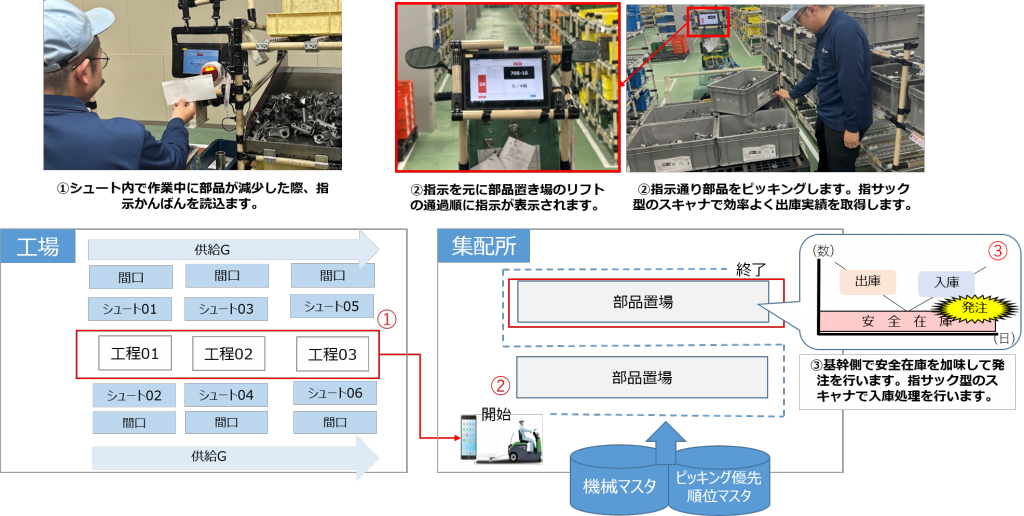 ②利用した部品情報を供給拠点に配信してピッキング指示を作成します。集配のタイミングでマスタ登録された優先順位どおりに部品を出庫し、指定のシュートまで集配を行います。集配した部品はかんばんのQRコードを読み込むことで出庫管理をしています。指輪型のスキャナを利用して効率よく入庫実績を取得しています。