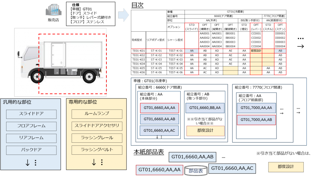 各部位の汎用的な複数の製品仕様を予め部品表として登録しておき、オプションリストから顧客要望に引き当て、定義されていない専用的な部位を都度設計することで、効率的に顧客の要望を対応することを可能にしました。