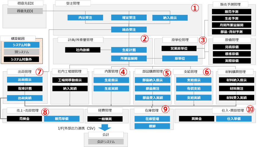 共通フォーマットからすべての受注データを取り込み(①)、受注データをもとに後工程管理ができる所要量計算(MRP)を構築しました。(②、③) 計算結果をもとに内製指示(④)、部品購買情報の入力・承認(⑤)、外注加工先への支給計画(⑥)、出荷指示・出荷実績照合、それに伴う売上データ作成を行いました。(⑦、⑧)