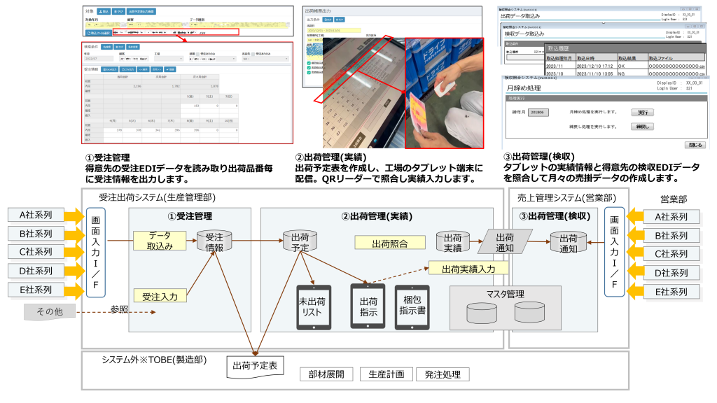 得意先毎に異なる内示・確定・変更のEDIデータを統合して受注情報を作成します。この受注情報をもとに製造現場で出荷計画を立案してハンディスキャナを利用して出荷実績を計上していきます。