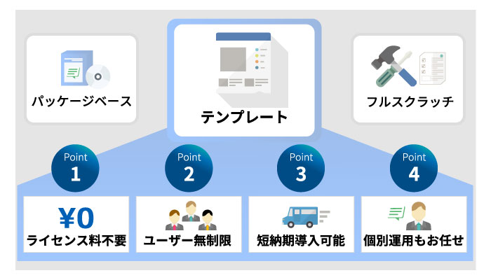 このテンプレート機能群を組み合わせてご要望のシステムを低価格・短納期に構築を行います。